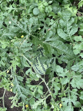 ハウスの中をせっせと整理整頓していましたら、あらなんと、少し時期外れの可愛いスイカができていました✨