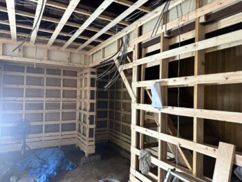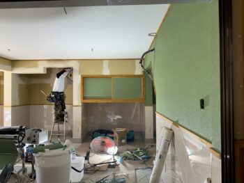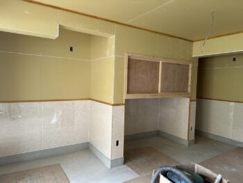 内装の下準備、キッチンパネル施工、クロス貼りを終えて、再度電気設備を整えて、